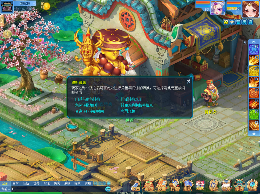 门派与角色转换功能在65级时解锁,负责这个功能的NPC是位于桃花坞的迦叶尊者。当然转职这件事也不是任何情况下都能转,还是有些限制的,比如你每30天只能转一次,而且门派首席无法转职。